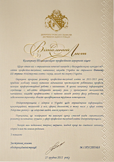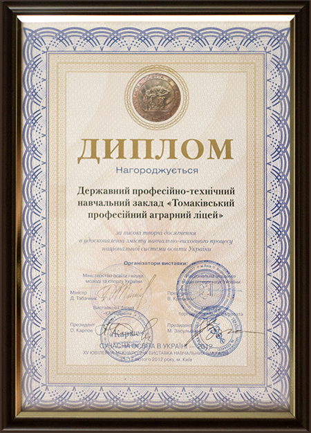 1. 3-є місце у обласній олімпіаді з професії "Водій автотранспортних засобів (категорія С) - РЯБОВОЛЕНКО ВЛАДИСЛАВ (гр.29, ТУ) 2. 3-є місце у Міжнародному мовно-літературному конкурсі імені Тараса Шевченка - МАКСИМЕНКО АНАСТАСІЯ (гр.2, ІI курс) 3. 3-є місце у обласній олімпіаді з фізики - РУСАНЕНКО ІВАН (гр.117, ІІI курс) 4. 2-е місце конкурс комп'ютерної графіки і анімації - КУЗЬМА ПАВЛО (гр.117, ІІI курс) 5. 1-е місце у проєкті "Томаківський Великдень" педагогічної лабораторії НМЦ ПТО "STEM-освіта в дії" - БІЛИНЕЦЬ НАТАЛЯ (гр.1, ІІI курс) 6. 1-е місце у обласному творчо-професійному проєкті "Бізнес-ідея сучасного фермерського господарства" - РЯБОВОЛЕНКО ВЛАДИСЛАВ (гр.29, ТУ) |
