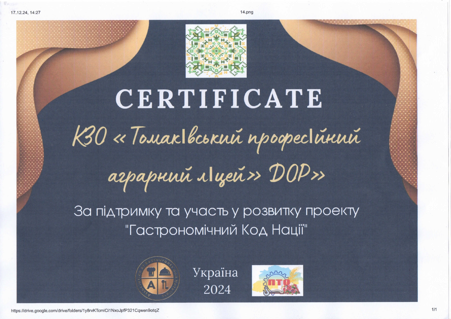 2. Сертифікат КЗО "ТПАЛ" ДОР" за підтримку та участь у розвитку проекту "Гастрономічний Код Нації" |