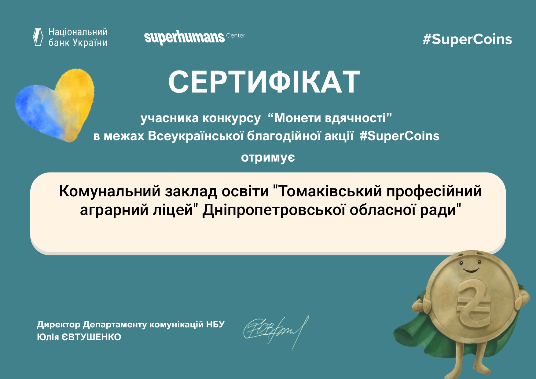 1. Сертифікат учасника конкурсу "Монети вдячності" в межах Всеукраїнської благодійної акції #SuperCoins КЗО "ТПАЛ" ДОР" |