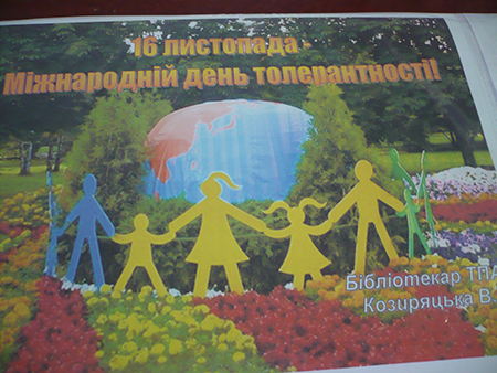 З 13 листопада по 16 листопада відповідно до листа НМЦ ПТО від 31.10.2012 за №13/4-242 «Про відзначення Міжнародного Дня толерантності» та плану роботи ліцею до Дня толерантності були проведені такі заходи: 1. Тематичні виховні години в навчальних групах 2. Позаурочний захід для учнів та педагогічних працівників ліцею проведений керівником Євроклубу "TOGETHER". |