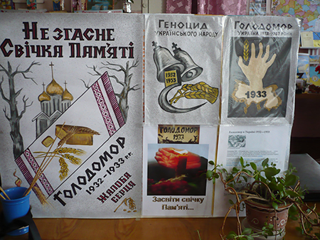 23 листопада були проведені такі заходи: 1. Урок-реквієм: «То був страшний навмисний голод», за участі учнівського колективу першого курсу. 2. Тематичні виховні години по групах «Голод -33». 3. Виставка стіннівок, плакатів. |