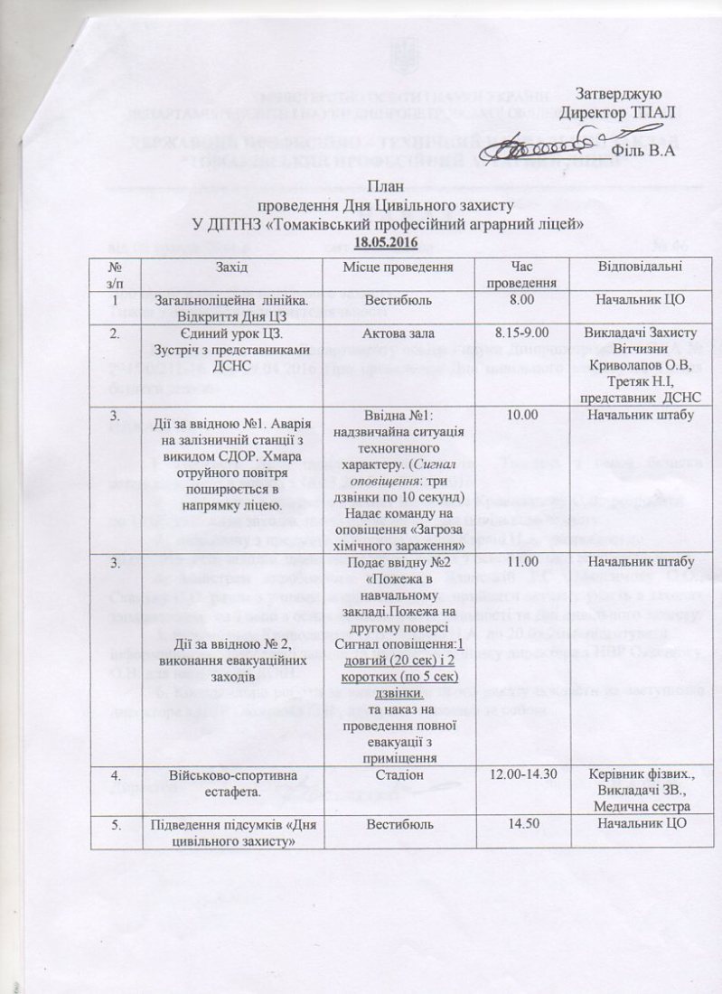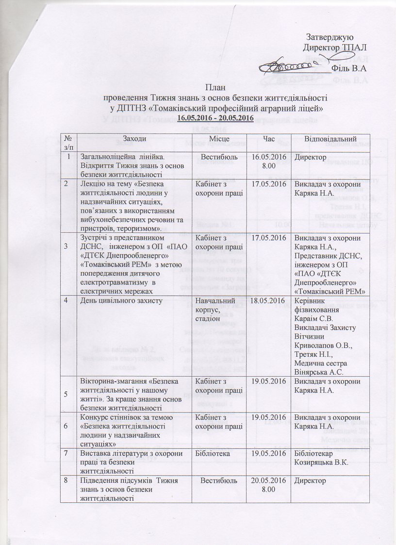 16 травня у ліцеї розпочався тиждень з основ безпеки життєдіяльності відповідно до листа Департаменту освіти і науки Дніпропетровської ОДА №2945/0/211-16 від 29.04.2016 «Про проведення Дня цивільного захисту та Тижня безпеки дитини».