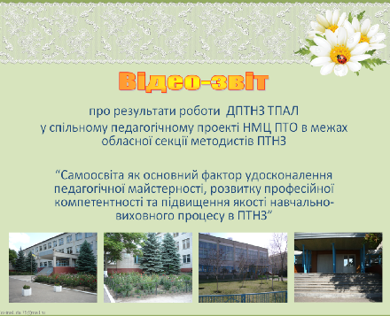 Результати роботи ДПТНЗ ТПАЛ в спільному педагогічному проекті НМЦ ПТО в межах обласної секції методистів ПТНЗ «Самоосвіта як основний фактор удосконалення педагогічної майстерності, розвитку професійної компетентності та підвищення якості навчально-виховного процесу в ПТНЗ» Переглянути відеозвіт: