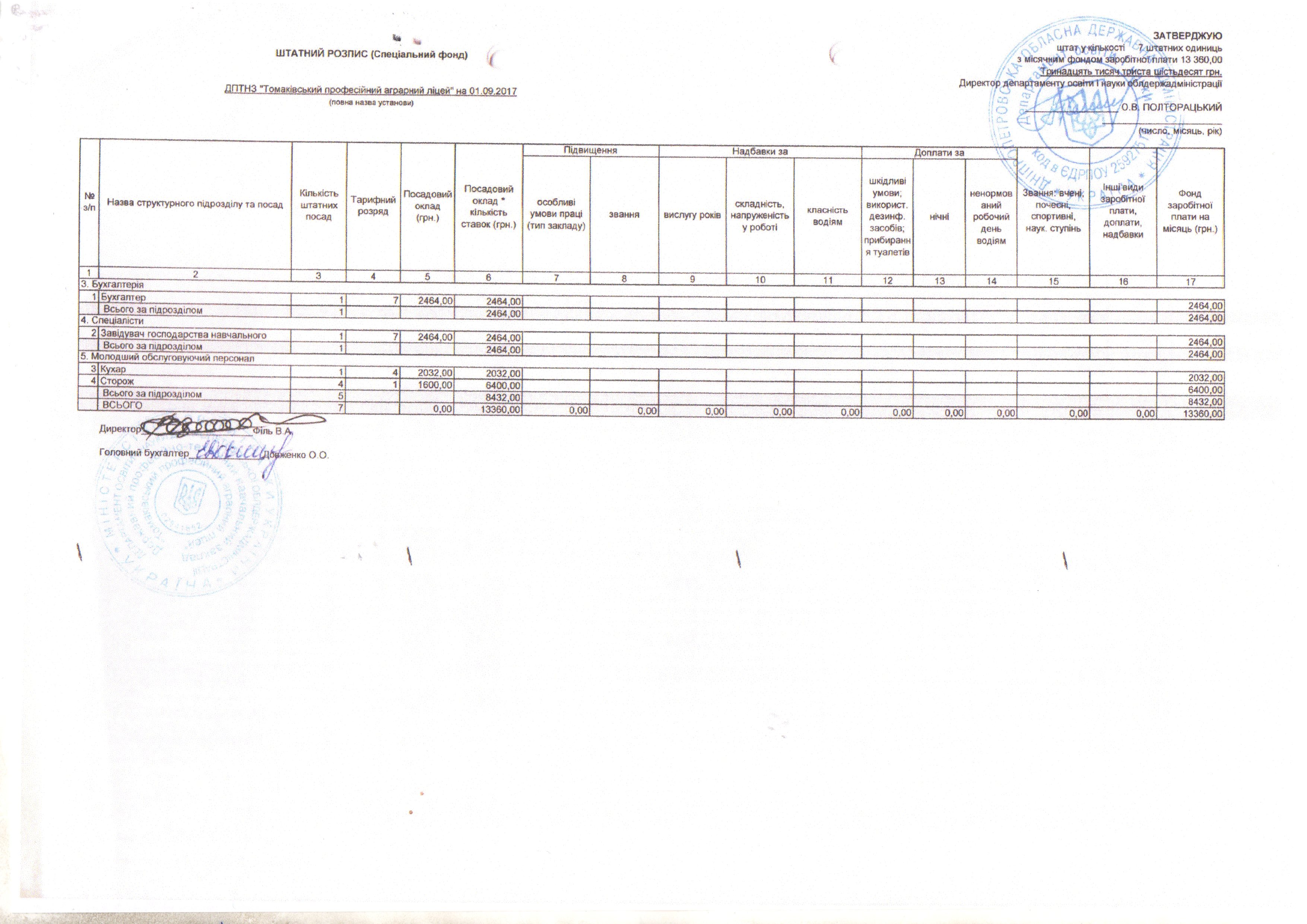 Штатний розпис станом на 01.09.2017(Спеціальний фонд)